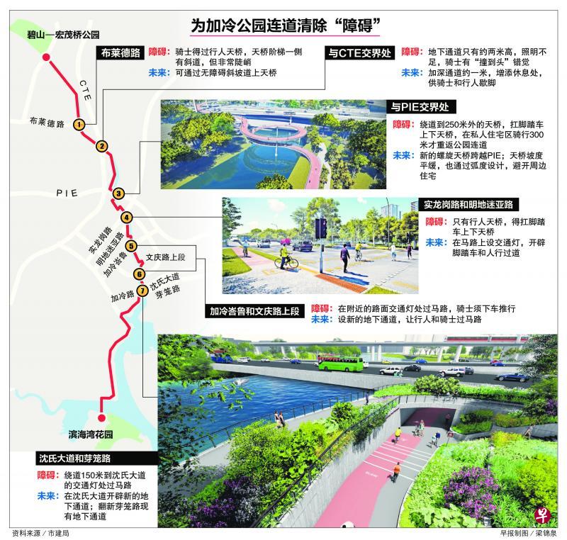 目前,公众沿着加冷河从碧山—宏茂桥公园骑车前往市区,途中会遇到各种“障碍”,例如在一些交界处,骑士得下车推车过马路,一些地点则得扛脚踏车上下人行天桥,甚至需要绕道才能回到加冷河畔。