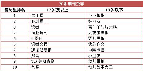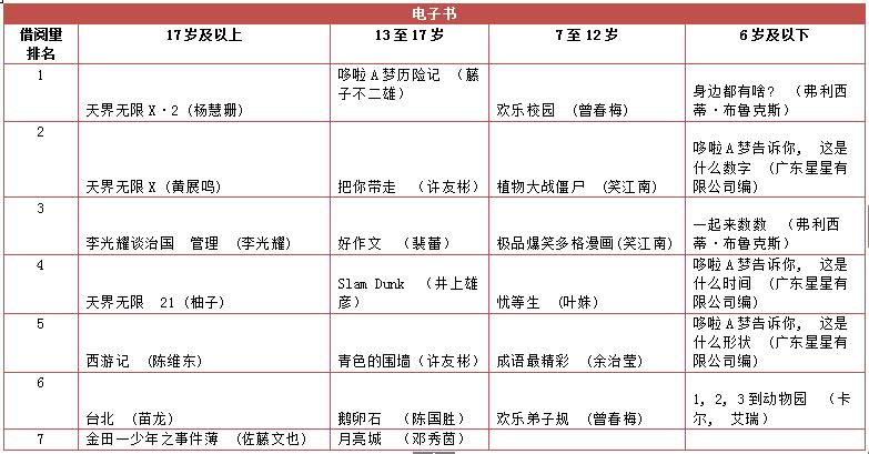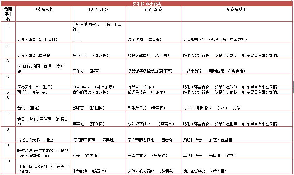 青少年(13岁至17岁)的读者则青睐幻想和神秘的小说。英文故事书中译本在7岁至12岁的读者的读者当中最受欢迎。台湾游记也吸引了不少华文读者借阅。