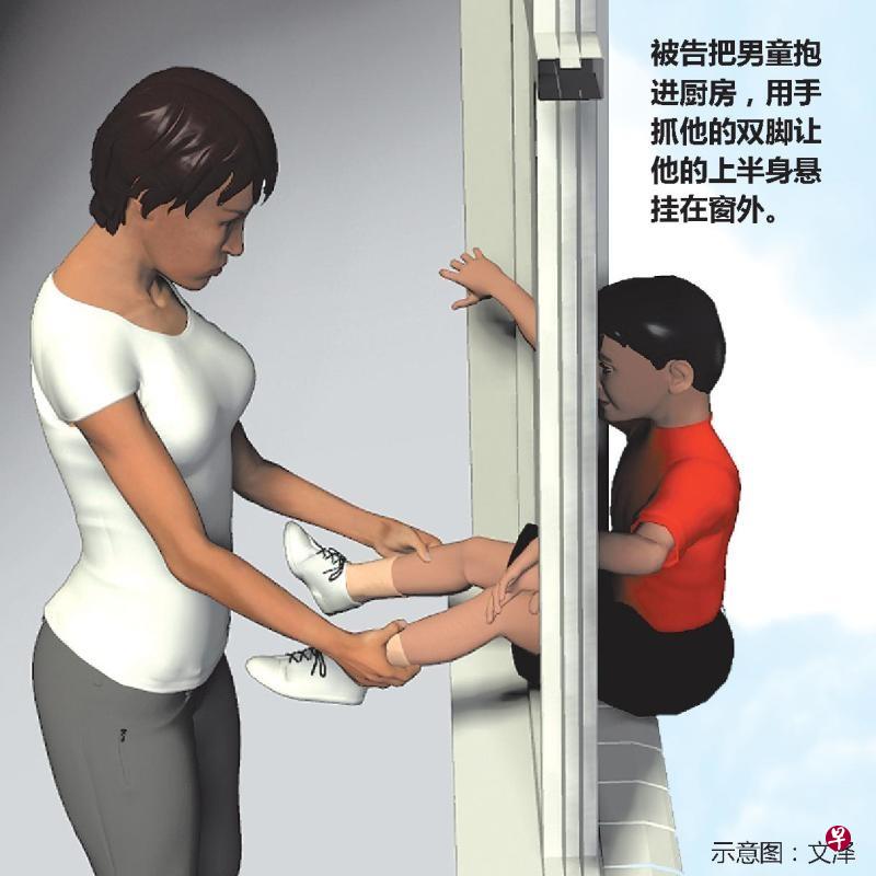 后来,被告走向男童,恐吓从三楼住家抛他下楼。她把他抱进厨房,用手抓他的脚让他的上半身悬挂在窗外。