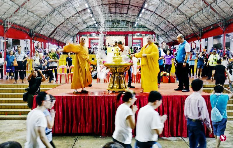 此外,信众也参与浴佛,即用勺子掬起净水淋在置于鲜花香水盆里的悉达多太子圣像,借此纪念佛祖,净化身心。
