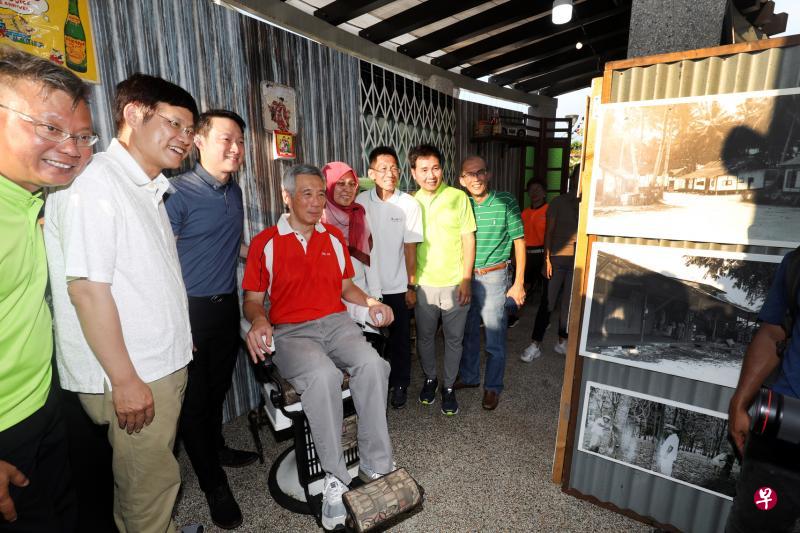 一组黑白旧照片呈现惹兰加由社区过去的历史面貌,让老居民缅怀甘榜时代的生活。参与“惹兰加由日”活动的李显龙总理(左三)昨天(7月28日)到该区的万国广场公园与居民同欢时,坐上活动展示区里摆放的旧理发椅,与议员和基层领袖合照。