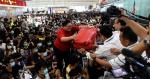 一名身穿红衣的妇女为了登机,高举着红色行李跨过数百名黑衣示威者,而她竟然是名新加坡人。
