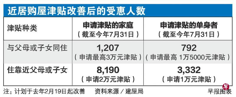 去年2月19日起,这项计划获得改善,购买转售组屋与父母或子女同住的家庭,可享有较高的近居购屋津贴,从之前的2万元提高到3万元。