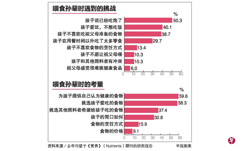 来自卫生部、新加坡国立大学杨璐龄医学院,以及新加坡国立大学苏瑞福公共卫生学院的研究员在2017年6月至2018年2月之间,向家中有12岁以下孙子孙女的396名本地祖父母进行问卷调查,了解一般家庭孩子用餐情况,论文发表在去年的《营养》(Nutrients)期刊。