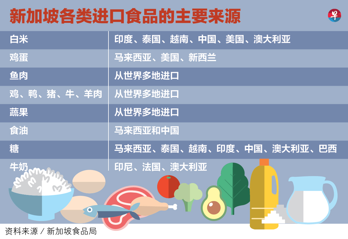 目前,本地农产品生产量占不到国人营养需求的10%,这表示我国所需的食品有逾90%仰赖进口。根据新加坡食品局网站,我国有12个各类食品供应的主要来源。马来西亚主要供应的有鸡肉、食油、鸭肉、鸡蛋、鱼肉、蔬果和糖。