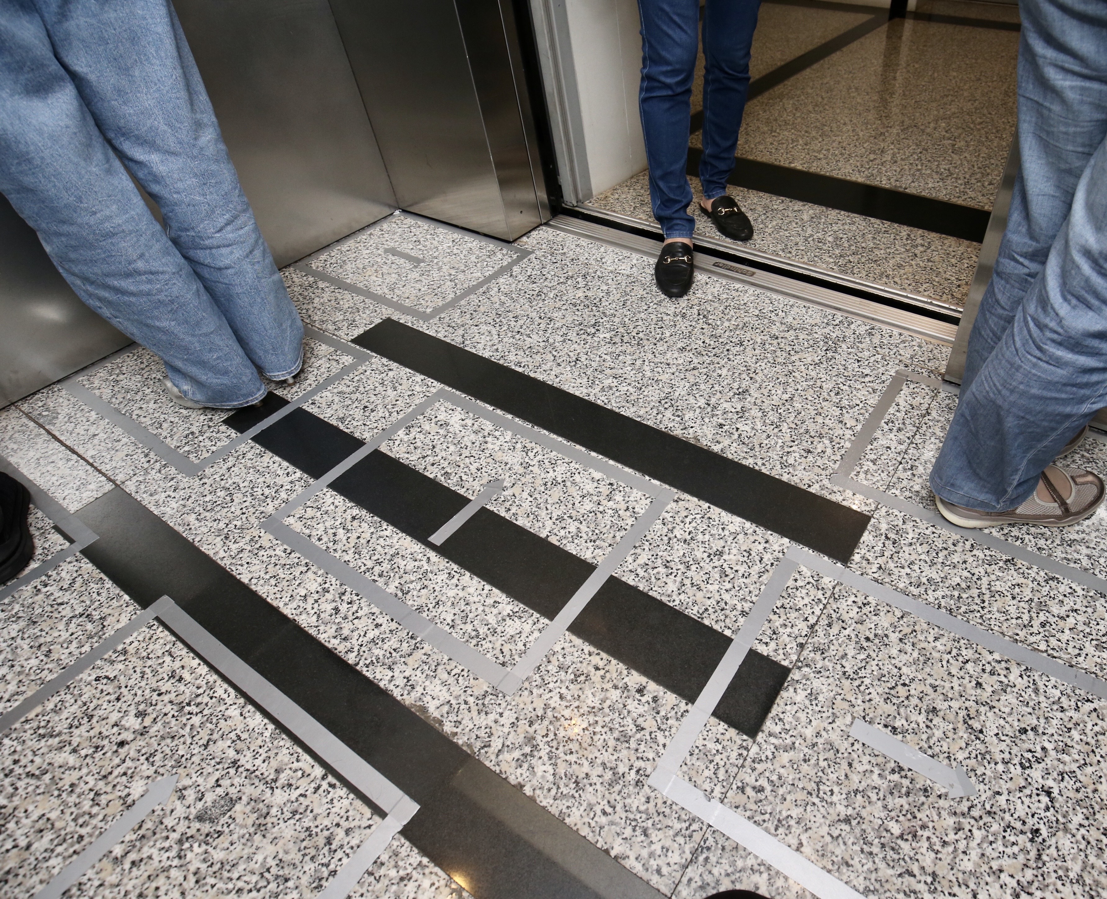 电梯的地板上划了灰色的格子。(邬福梁摄)