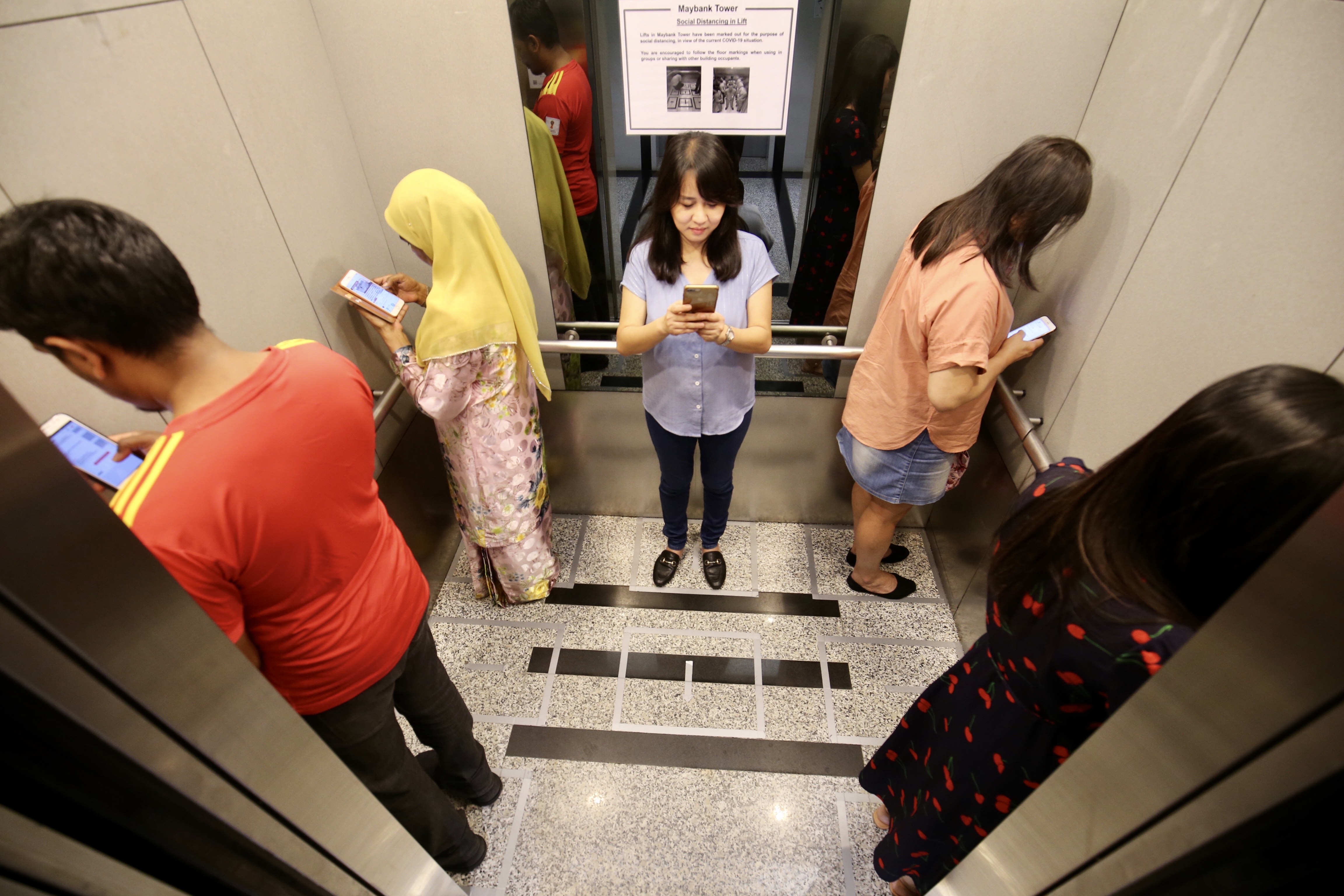 为了减少职员的接触,马来亚银行大厦从昨天下午开始在电梯内划分格子,让职员“各自面壁”背对彼此,减少感染风险。(邬福梁摄)