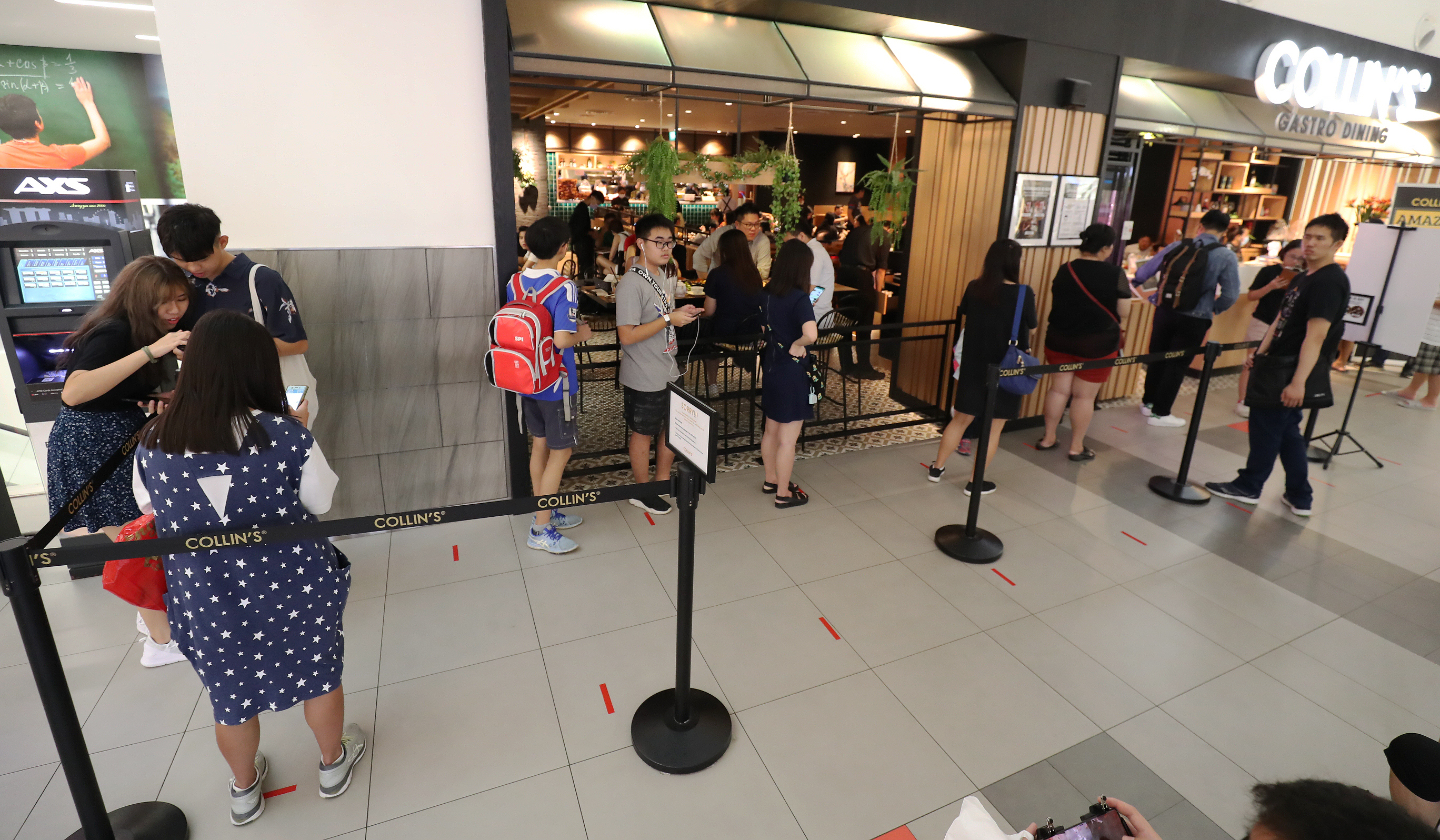 本地餐饮品牌Collin's即日起也在NEX店面推行安全距离措施,让顾客在等候时保持安全距离。不愿排队的也可以留下电话号码,轮到你用餐时餐厅会打电话通知你。(陈来福摄)
