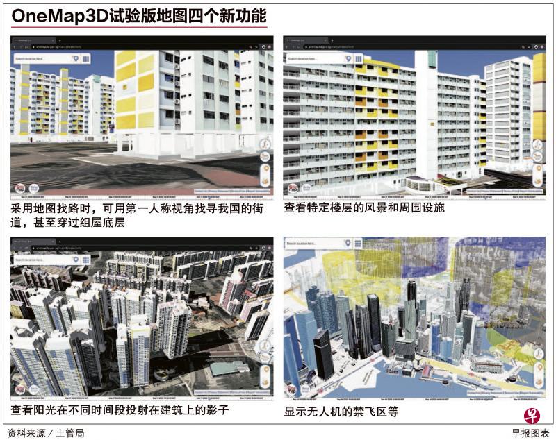 即日起可上网查阅的互动地图OneMap3D试验版,可选定楼层视察周围景观,以及每天不同时段阳光投射在建筑上的影子,也可查询现行的无人机禁飞区等。