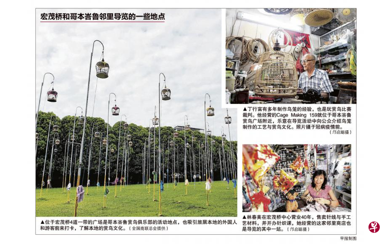 宏茂桥哥本峇鲁区有个吸引外国人前来“打卡”的赏鸟广场,还有个鸟笼制作达人分享赏鸟文化的特色店。