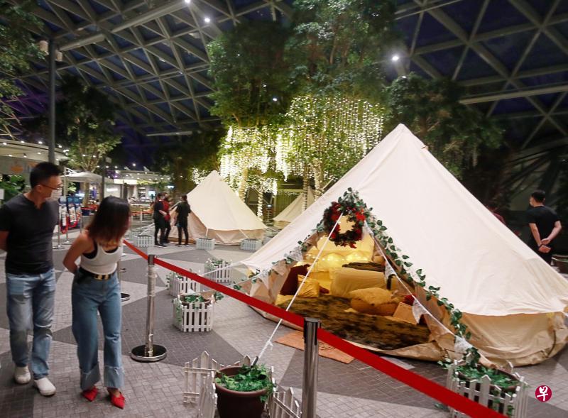 每个帐篷可住三四个成人,或两个成人及两三个小孩。住宿配套还包括星耀樟宜圣诞活动体验、樟宜时空体验馆或天空之网门票及购物折扣等。(唐家鸿摄)