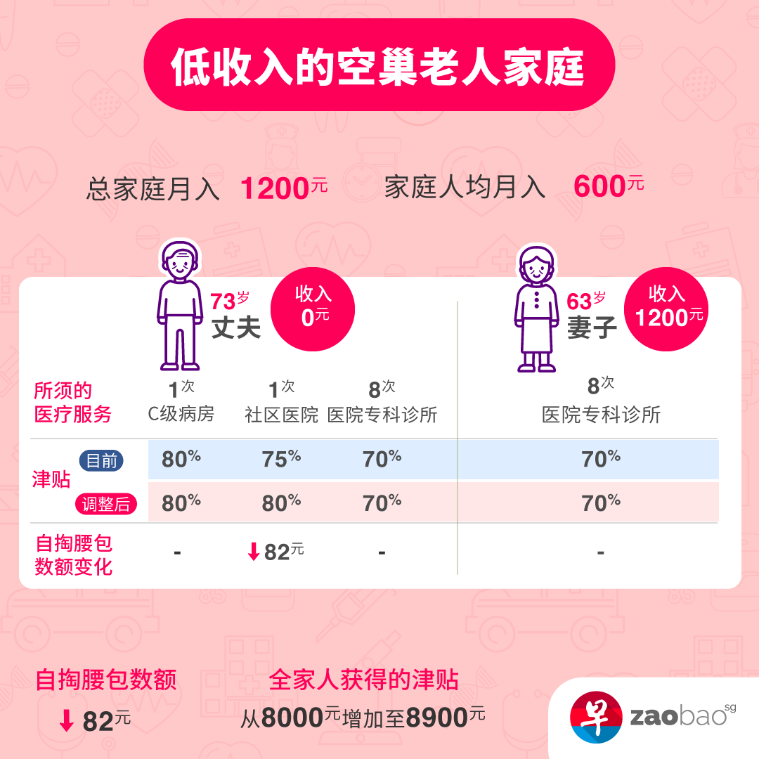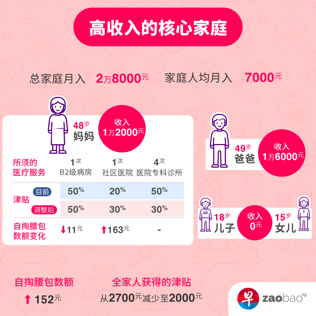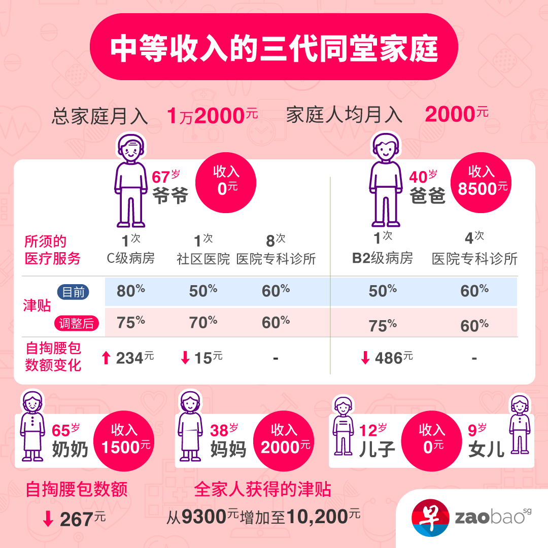 说了那么多,大家最关心的或许还是自己一家人的津贴是否会变多或变少。zaobao.sg以三个不同结构的家庭和收入等级,以家中有一或两名成员需要住院为例,带大家看一看不同家庭可能面对的变化。