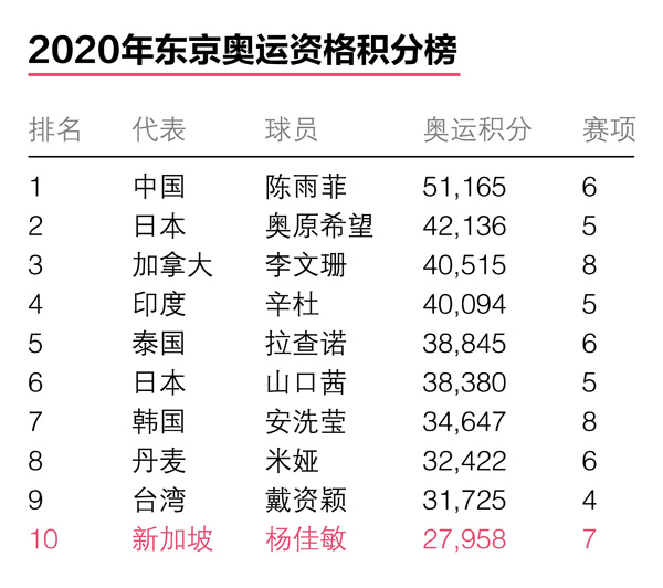 杨佳敏是新加坡首位获得世界青年排名第一的羽毛球运动员,上周(8月23日)在世锦赛更创造了打入八强的佳绩,其中爆冷击退世界排名第一的山口茜之战役,更让她一战成名。