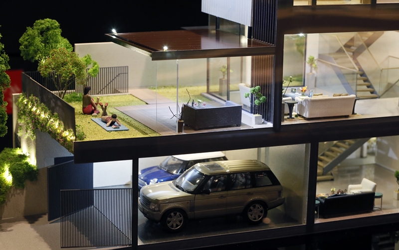 听了建筑师解释我才知道,原来这里地势较高,有一定坡度。为了让道路坡度符合当局规定,发展商削低土地高度后,原本的地下层露出地面,几乎和普通路面一样高。建筑师就把停车坪设计在地下层,将客厅外的空间改造为天台花园,汽车其实就停在这片花园的正下方。这样一来,从客厅望出去的景观更怡人,一家人也有更多活动空间。