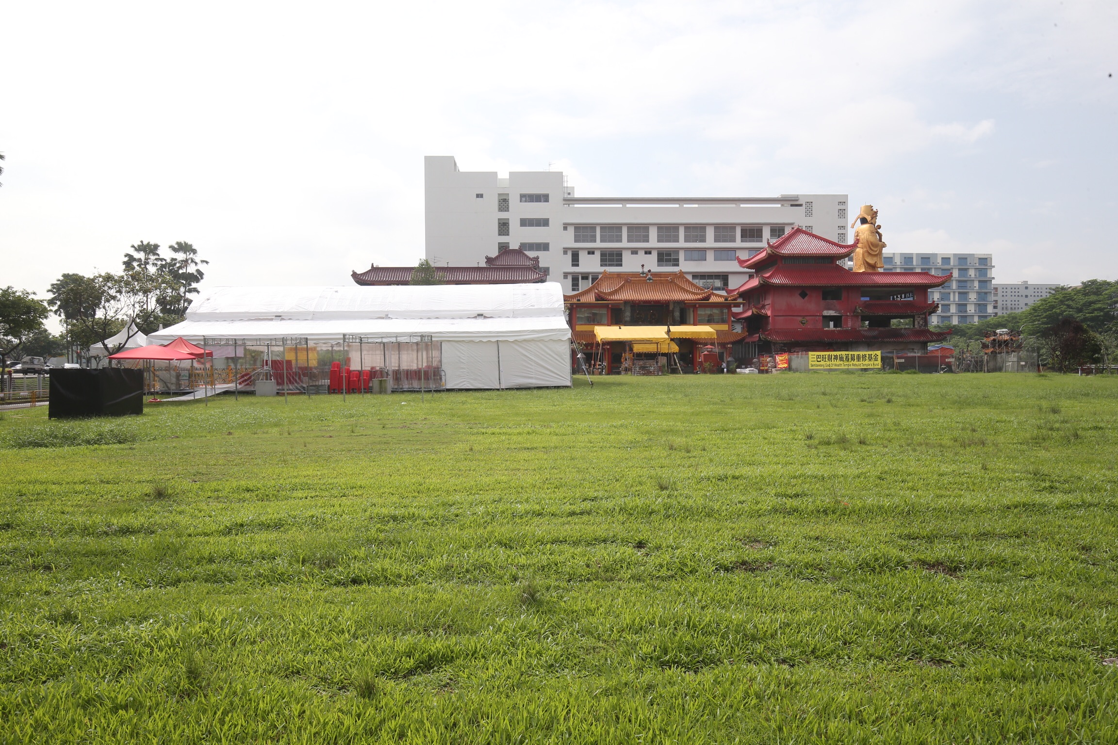 (早报讯)两个月前遭大火吞噬,三巴旺财神庙数天前刚获得当局的批准,马上就在庙前的草地搭建帐篷作为临时庙宇,来临的星期五将开放供信众参拜。